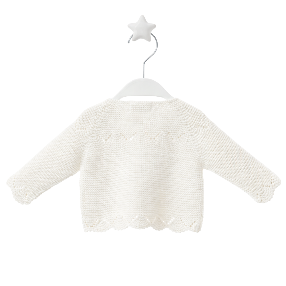 Descrição: Casaco de malha branco pérola, delicado e intemporal, perfeito para completar os looks do seu bebé em ocasiões especiais ou no dia a dia. Confortável, suave e elegante — uma peça essencial no guarda-roupa dos mais pequenos.