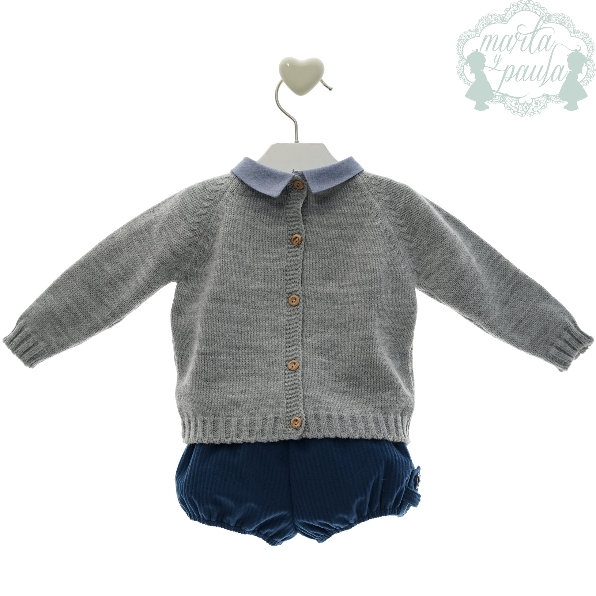Descrição: Conjunto de inverno para bebé menino, composto por camisola de malha cinzenta com aplicação de pequenas bolas coloridas e gola camisa azul, combinada com calções em bombazine azul-escura. Um look confortável e cheio de charme para os dias frios.