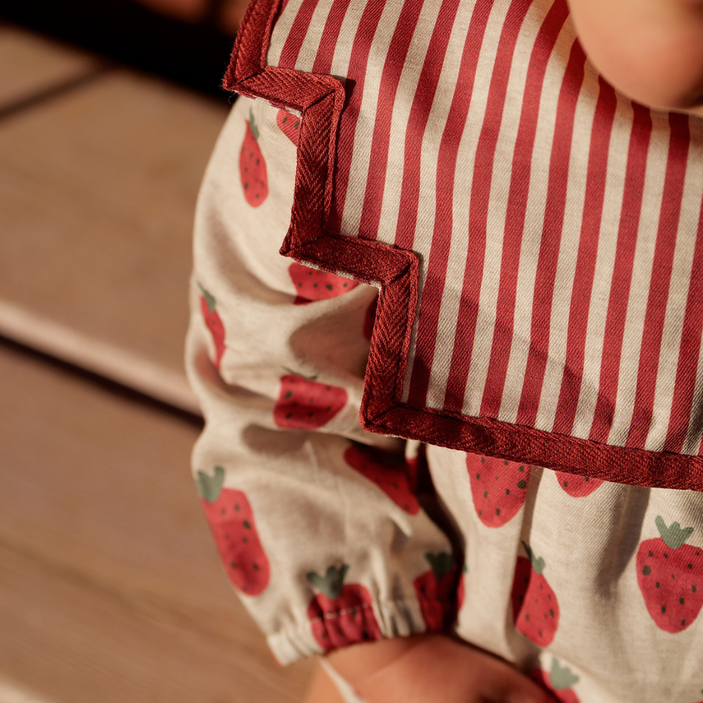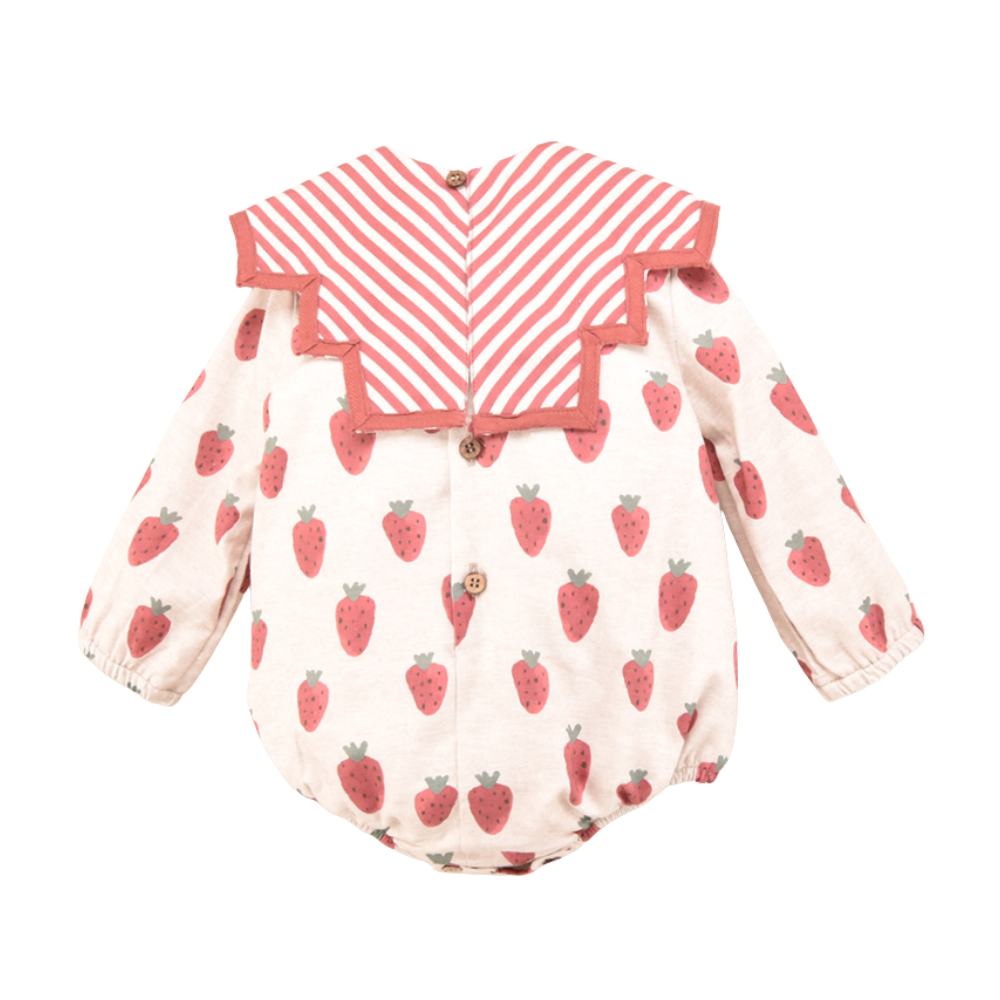 Descrição: Fofo de manga comprida para bebé, em tecido estampado com morangos vermelhos. Acompanha gola removível às riscas vermelhas e brancas, que permite variar o look de forma prática e elegante. Confortável, versátil e cheio de charme para ocasiões especiais ou para o dia a dia.