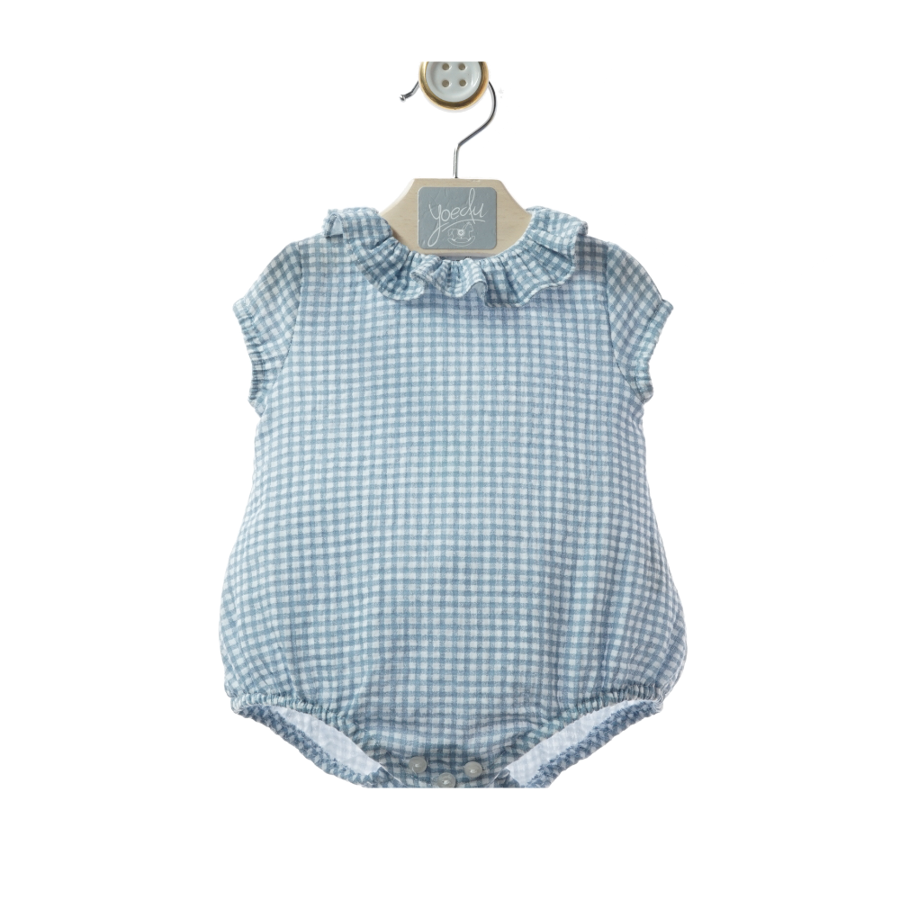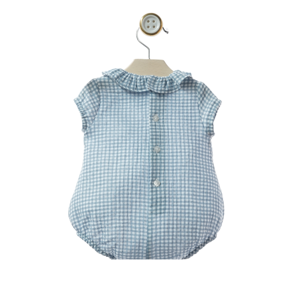 Descrição: Fofo de bebé em tecido vichy azul, leve e confortável, perfeito para os dias mais quentes. Com gola com folho e manguinhas com acabamento franzido, combina um ar clássico com um toque delicado. Apertos com botões nas costas para vestir facilmente e molas na entreperna para facilitar a muda da fralda. Ideal para ocasiões especiais ou para o dia a dia com aquele detalhe “Babydita”.