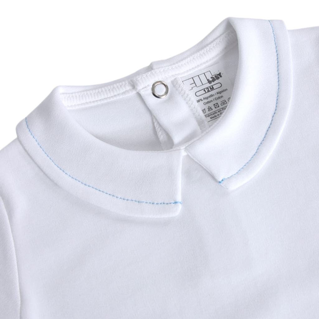 Descrição: Body de manga comprida em algodão macio com gola elegante em branco e delicado bordado em azul. Um essencial confortável e versátil para o dia a dia do bebé, perfeito para usar sozinho ou combinado com outras peças.