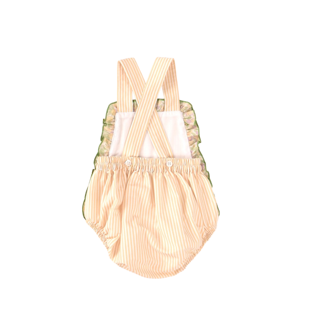 Descrição: Fofo de bebé com padrão de riscas suaves e delicado folho floral nas laterais, ideal para um look fresco, confortável e encantador. Um modelo prático e elegante, perfeito para os dias mais quentes e para ocasiões especiais.