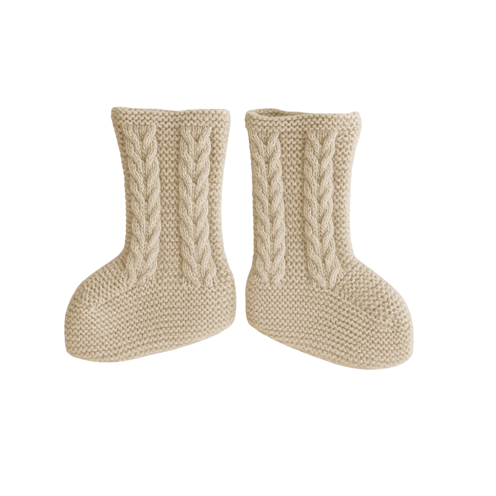 Descrição: Botinhas de malha em tricot bege, feitas em fio macio e confortável, perfeitas para manter os pés do bebé quentinhos e protegidos. O design com tranças dá um toque clássico e elegante, ideal para os primeiros meses de vida.