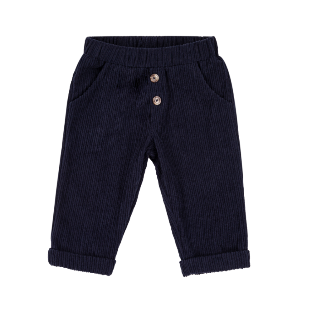 Descrição: Calças de bebé em bombazine azul marinho, com cintura elástica e botões decorativos na frente. Um modelo confortável, prático e cheio de estilo para o dia a dia.