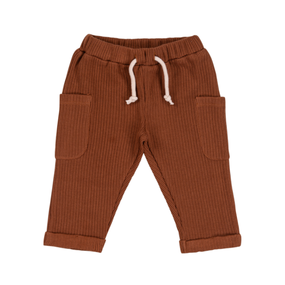 Descrição: Calças de bebé em malha canelada castanha, com cintura elástica ajustável e cordão. Confortáveis, práticas e perfeitas para o dia a dia dos mais pequenos.