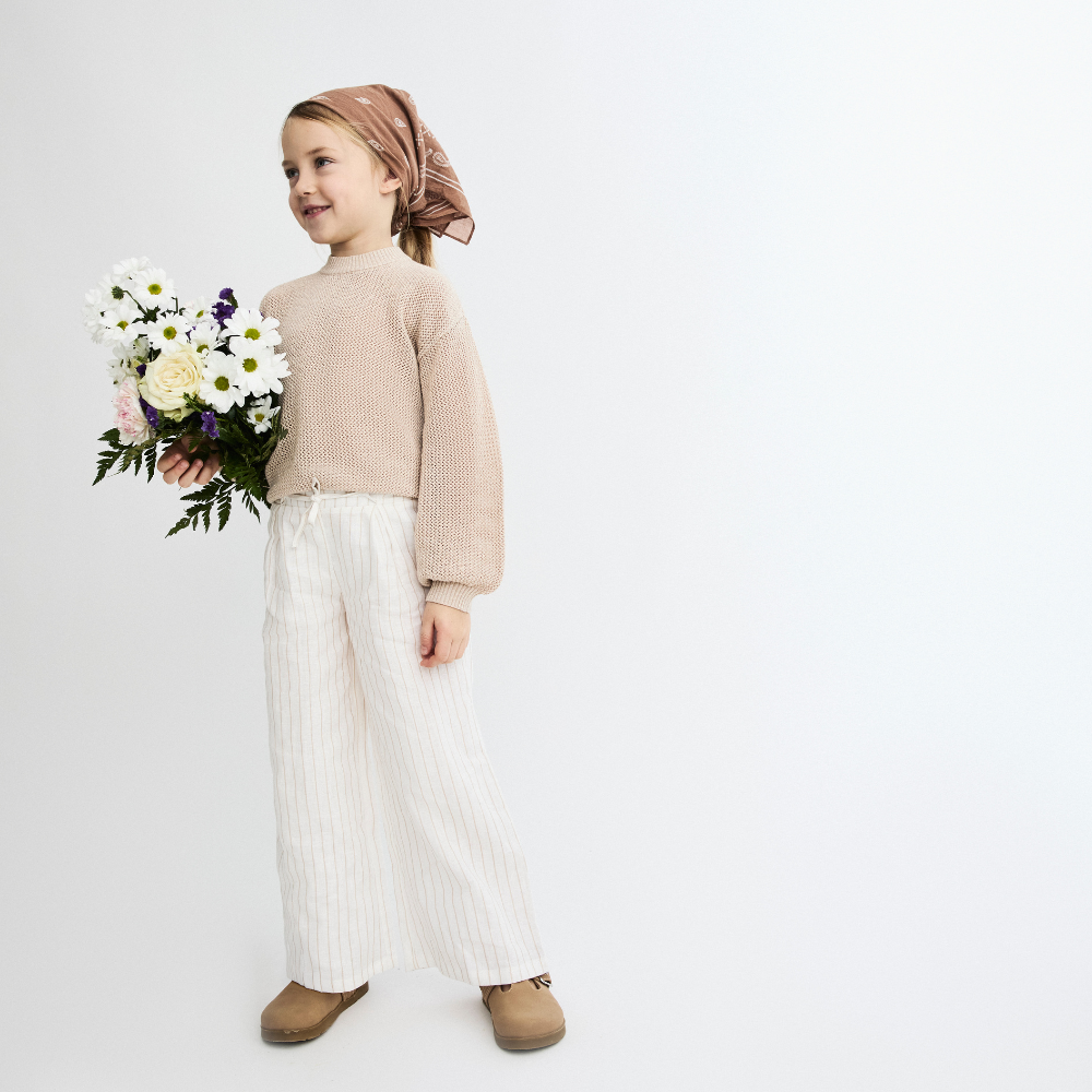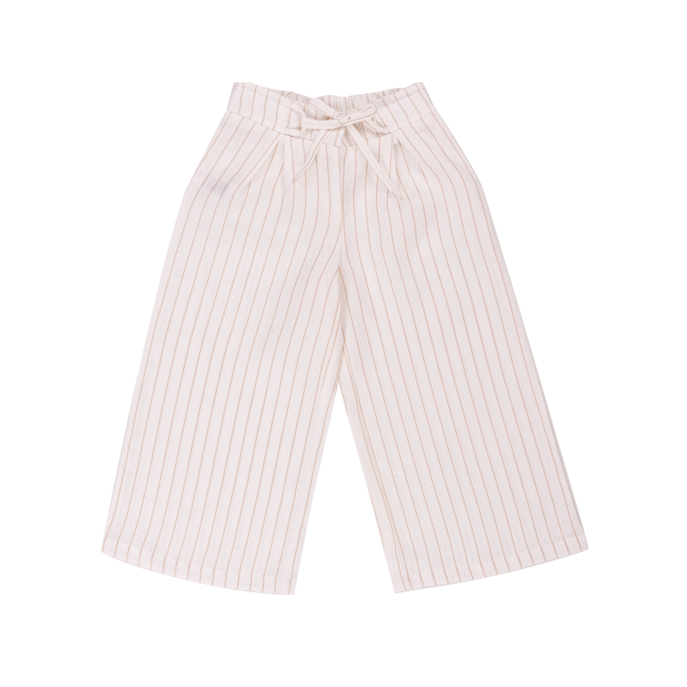 Descrição: Calças largas para menina em linho branco com riscas bege. Um modelo leve, fresco e confortável, com cintura subida e laço decorativo, ideal para looks delicados e elegantes nos dias mais quentes.