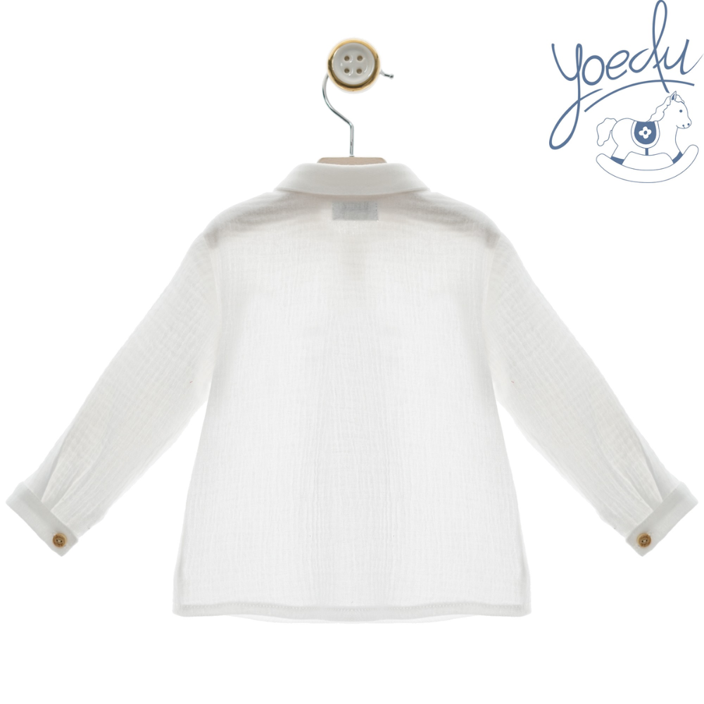Descrição: Camisa de bebé para menino da marca Yoedu, confeccionada em tecido branco, leve e confortável. Com mangas compridas, gola clássica e fecho com botões frontais em madeira, é uma peça versátil e elegante, ideal para compor looks delicados e frescos.
