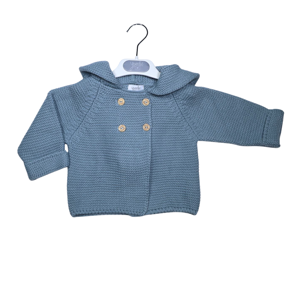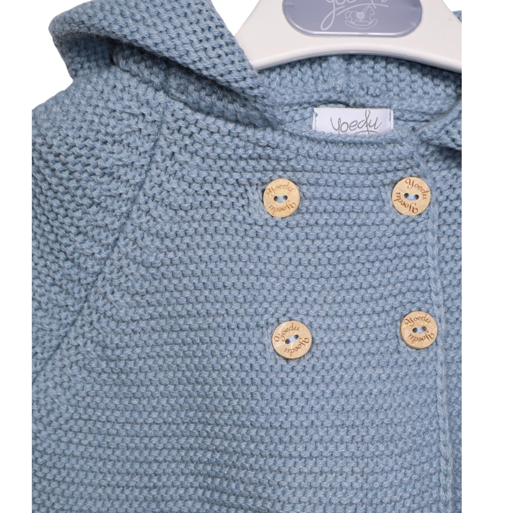 Descrição: Casaco de malha para bebé em azul, com capuz e detalhe em pompom. Fabricado em malha macia e confortável, apresenta um design intemporal e prático, ideal para manter o bebé quente nos dias mais frescos. Um essencial versátil e elegante para o guarda-roupa dos mais pequenos.