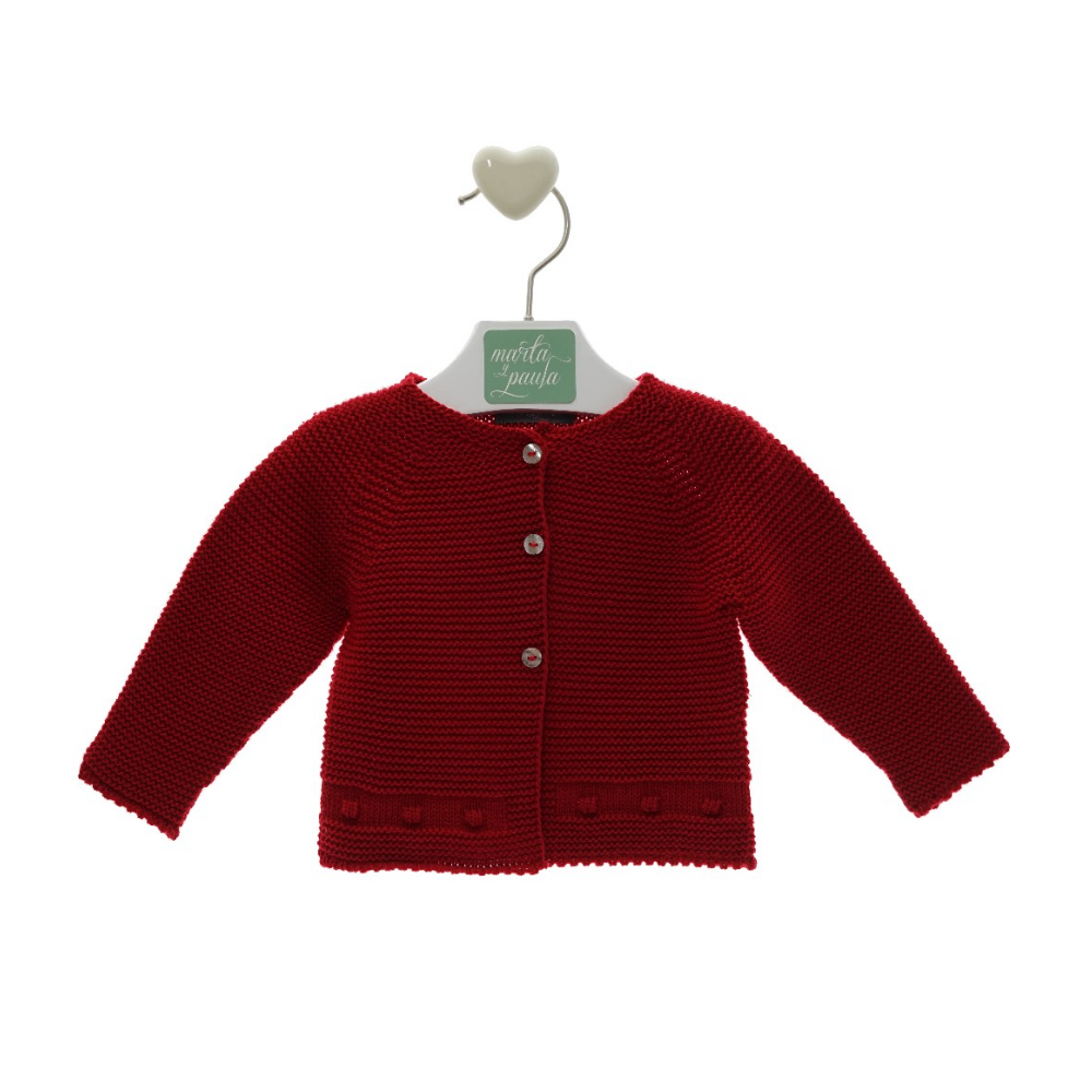 Descrição: Casaco de malha para bebé menina, em tricô vermelho, com acabamento em ponto mousse e delicados pormenores em relevo. Fecha à frente com botões, oferecendo conforto e um toque clássico para os dias mais frescos.