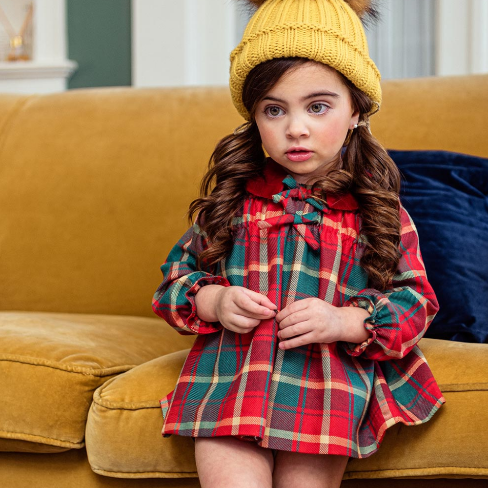 Descrição: Adorável conjunto composto por vestido em padrão xadrez vermelho e verde com gola em veludo e laços decorativos na frente, acompanhado por tapa fraldas a condizer. Um look clássico e confortável, perfeito para ocasiões especiais.