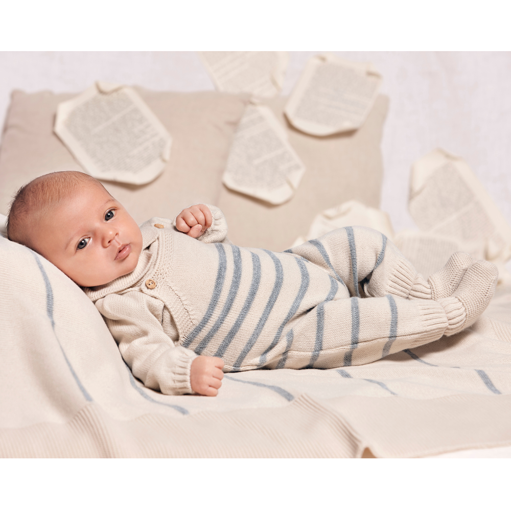 Conjunto bebé menino de malha bege com jardineiras às riscas - Juliana