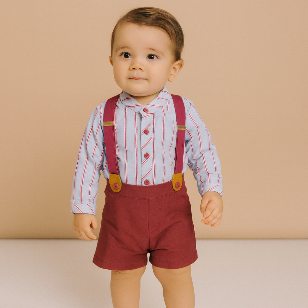 Descrição: Conjunto elegante para bebé menino da marca Marta y Paula, composto por camisa às riscas, calções e suspensórios a condizer. Um look clássico, confortável e cheio de estilo para ocasiões especiais ou para o dia-a-dia mais requintado.