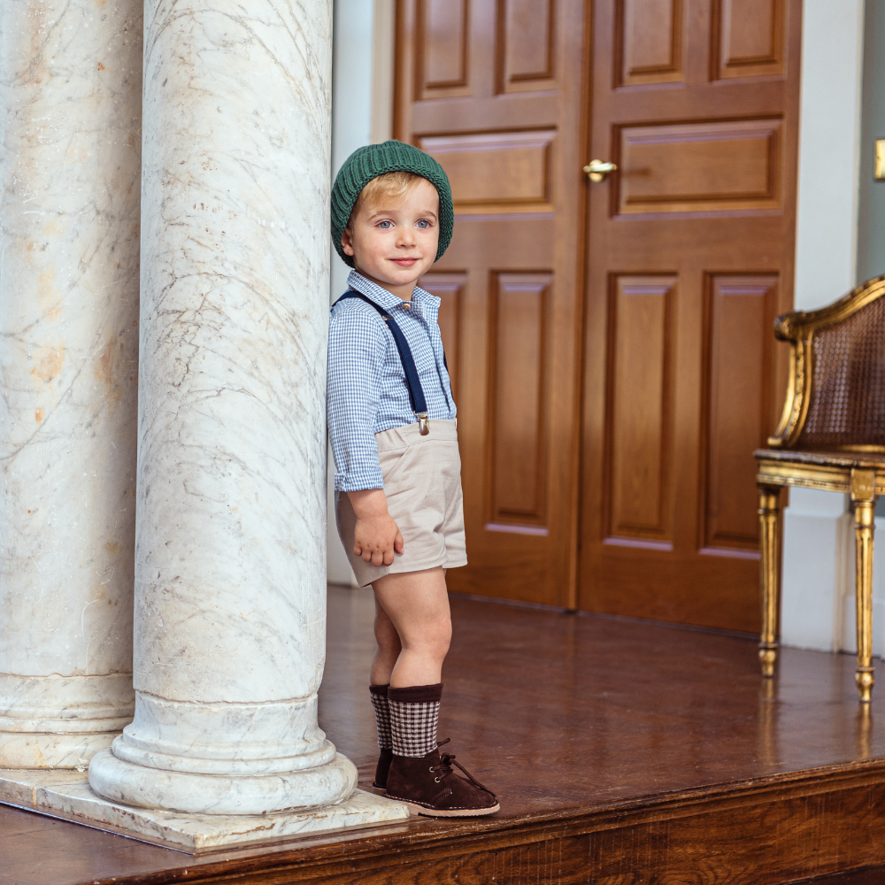 Descrição: Conjunto para bebé menino com camisa de xadrez com botões em madeira, calções beges e suspensórios ajustáveis. Um look clássico e elegante para os mais pequeninos.