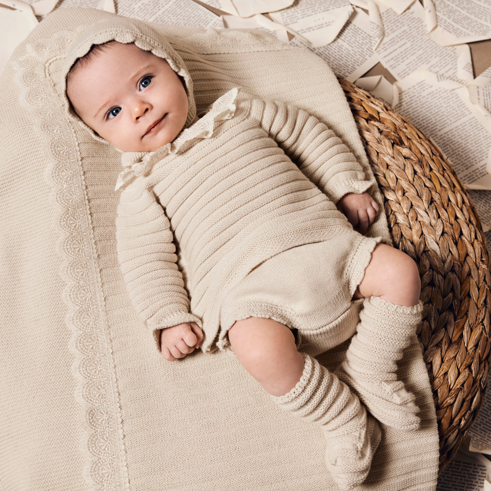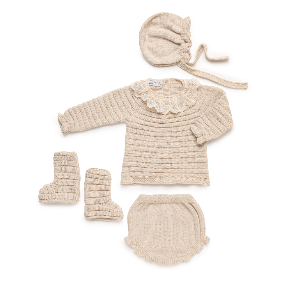 Descrição: Conjunto de malha para bebé em tom bege, composto por camisola com delicada gola em renda, tapa-fraldas, botinhas e touca a condizer. Uma escolha clássica e confortável, perfeita para ocasiões especiais ou para oferecer como presente cheio de ternura.