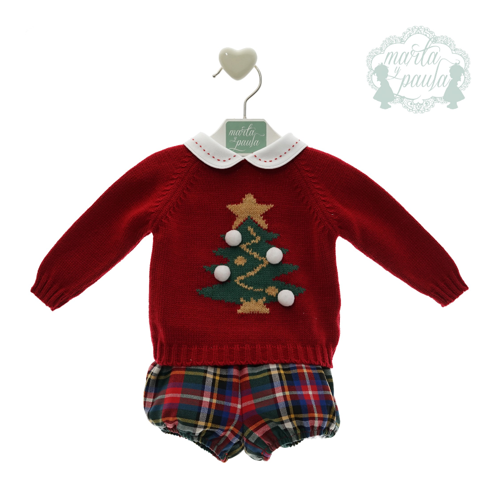 Descrição: Conjunto de Natal para bebé, composto por camisola de malha vermelha com motivo de árvore de Natal e aplicação de pompons, combinada com calções de xadrez em tons festivos. Perfeito para vestir o seu bebé com charme e conforto nesta época especial.