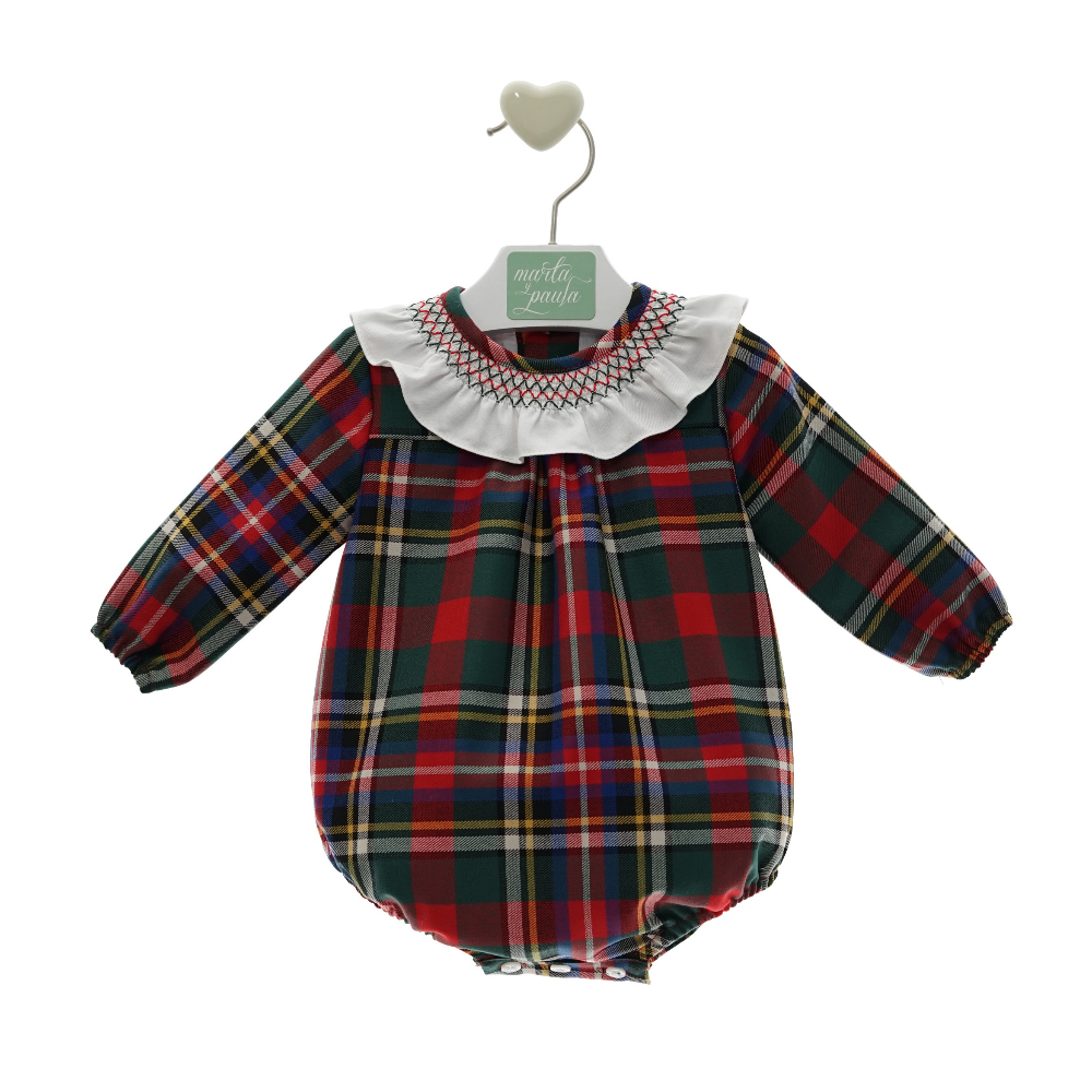 Descrição: Fofo para bebé menina da Marta y Paula, em padrão xadrez vermelho, verde e azul, com gola branca franzida e detalhe bordado smock no peito. Confortável e elegante, ideal para o natal ou ocasiões especiais.
