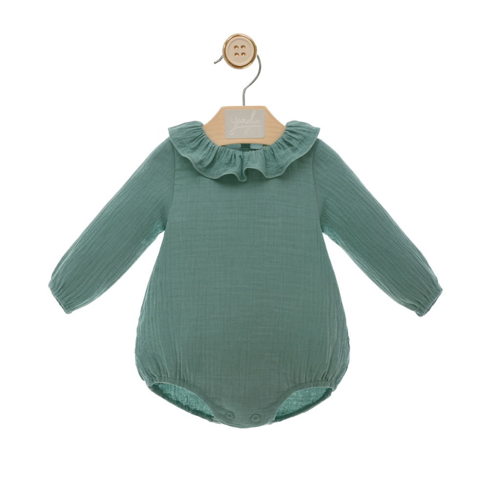 Descrição: Fofo verde em algodão para bebé, com gola e manga comprida. Confortável, elegante e intemporal, é perfeito para ocasiões especiais ou para um look clássico e delicado no dia a dia.