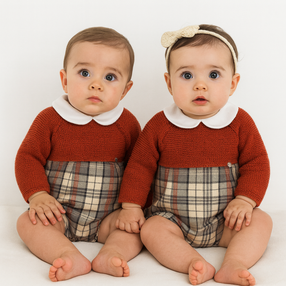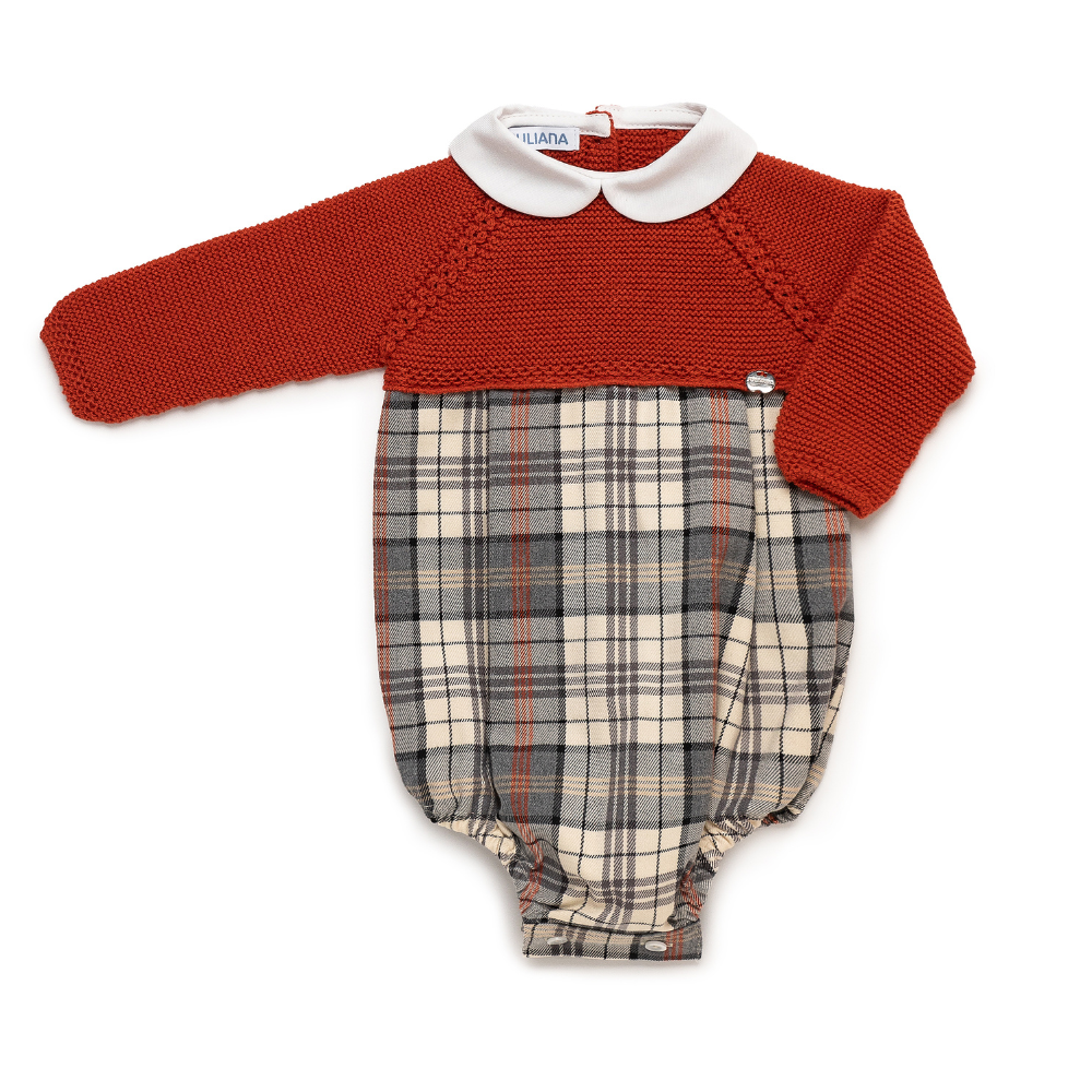 Descrição: Fofo unissexo para bebé com parte superior em malha cor tijolo e gola branca redonda, combinado com parte inferior em tecido xadrez em tons de bege, cinza e vermelho. Uma peça elegante e confortável, ideal para ocasiões especiais ou para um look clássico no dia a dia.