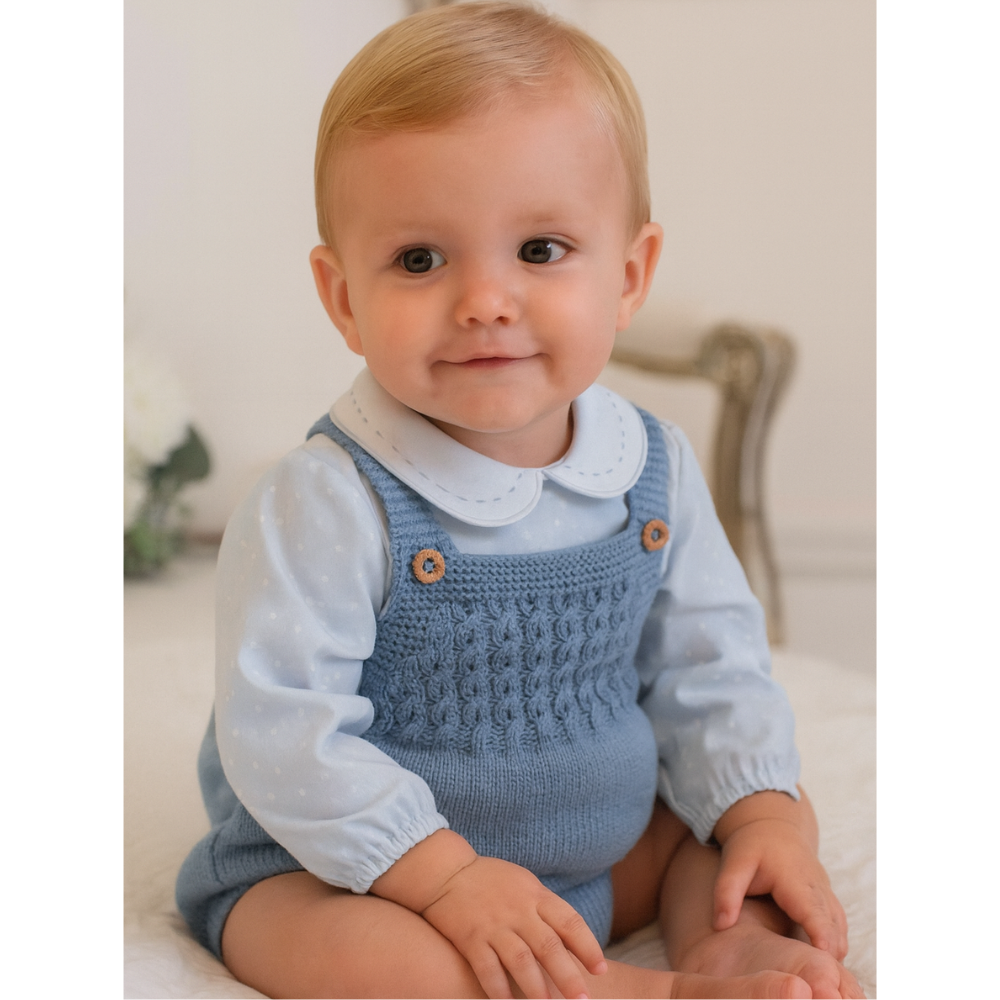 Descrição: Conjunto infantil de Inverno da marca Yoedu. A blusa azul bebé com gola branca traz um toque clássico e sofisticado. O macacão em malha com detalhe texturizado na parte superior e botões decorativos completa o look com muito charme e conforto.