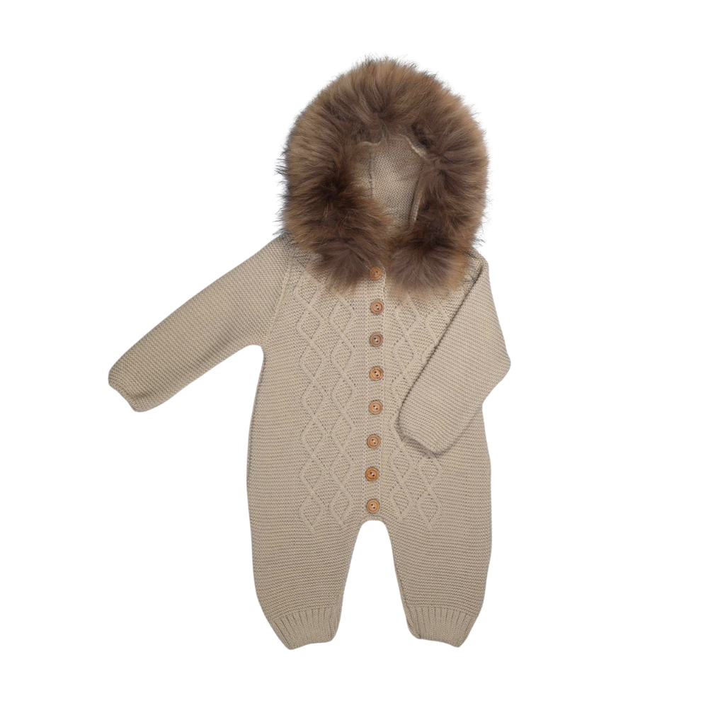 Descrição: Macacão de malha em tom bege, com padrão delicado na parte da frente e capuz forrado com pelo sintético removível. Uma peça prática, confortável e elegante, ideal para manter o bebé quente nos dias frios, com a versatilidade de usar com ou sem pelo.
