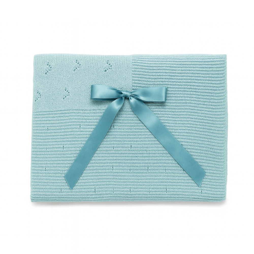 Descrição: Manta de malha para bebé, com elegante laço de cetim. Macia, confortável e delicada, é ideal para aconchegar o bebé em qualquer ocasião, combinando funcionalidade com um toque clássico de charme.