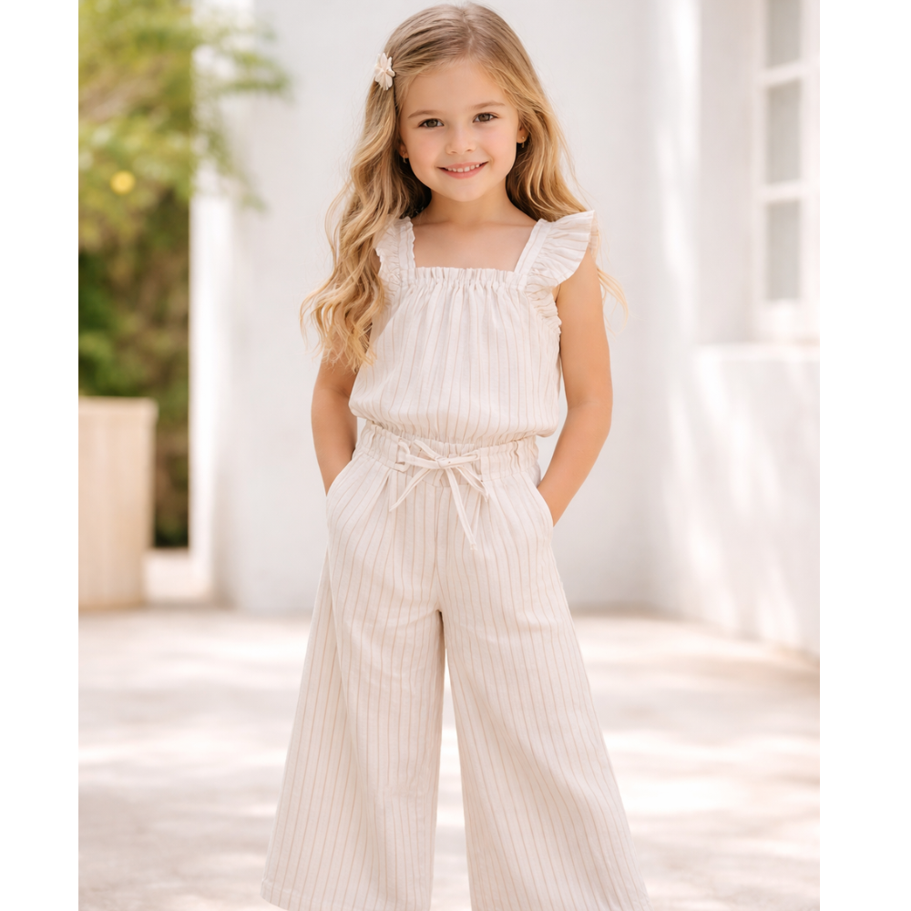 Descrição: Top para menina em linho branco com riscas bege, leve e fresco para os dias mais quentes. Com alças largas em folho e acabamento franzido, é uma peça delicada e confortável para looks de verão.
