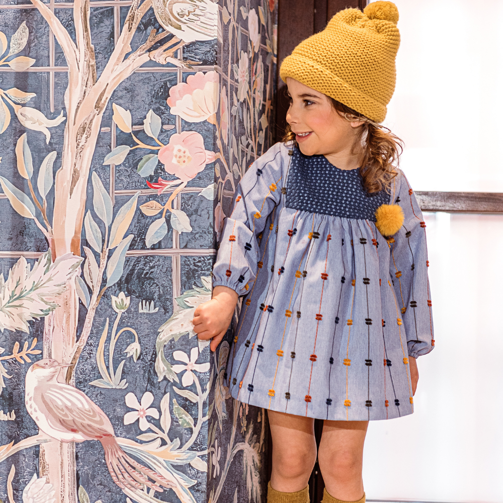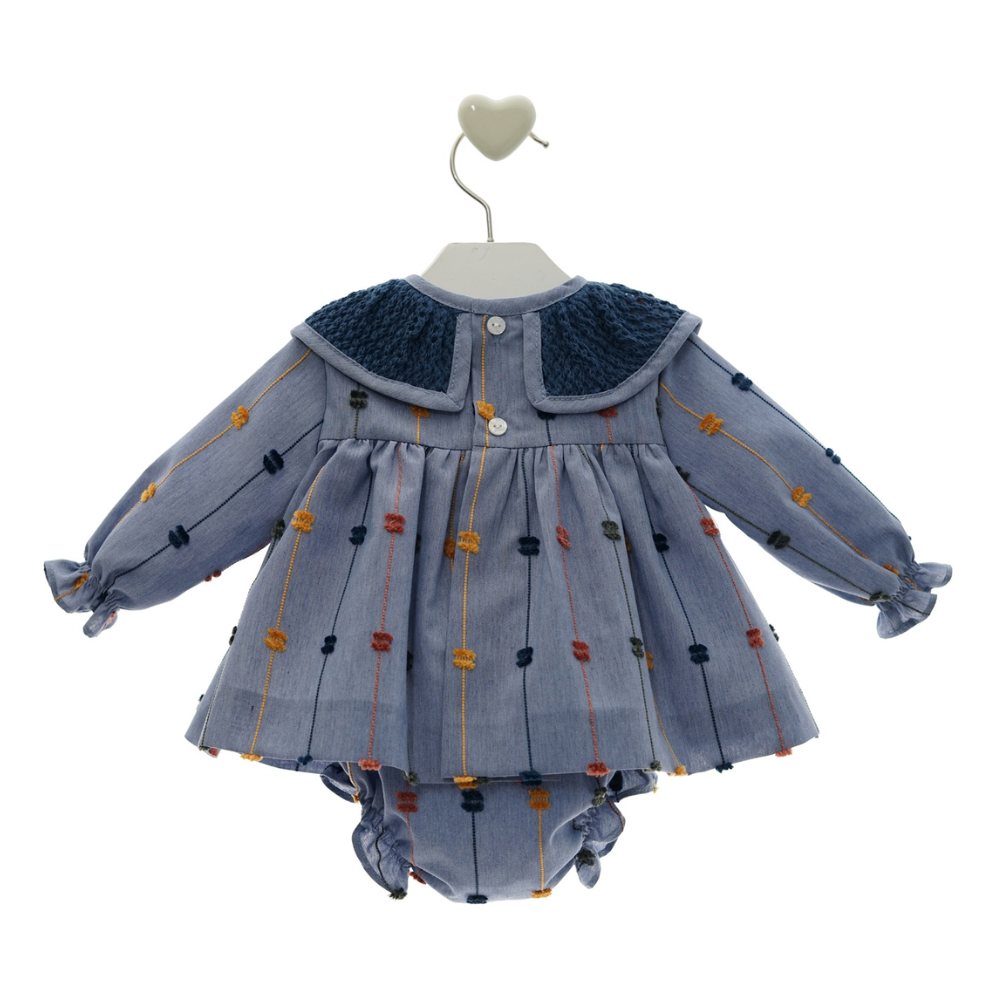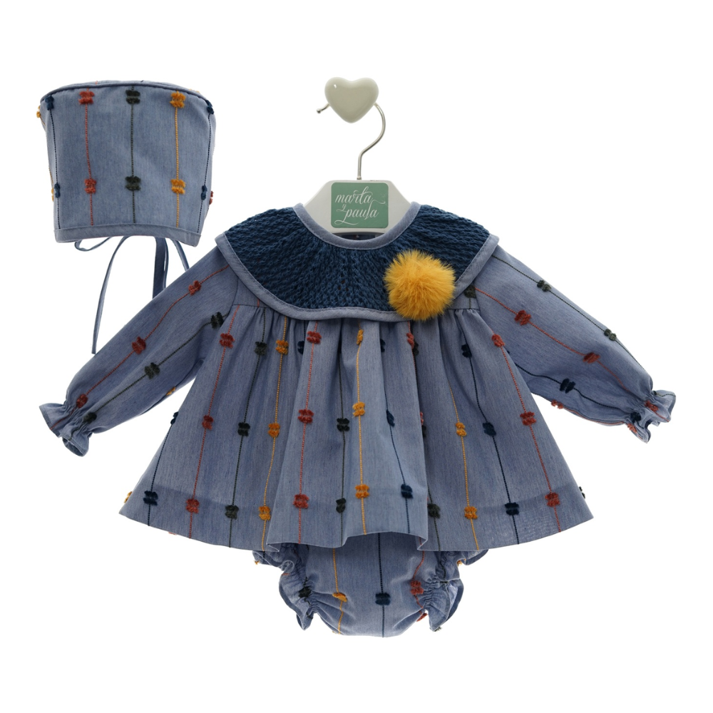 Vestido de bebé azul com bordado colorido, cueca e touca - Marta y Paula